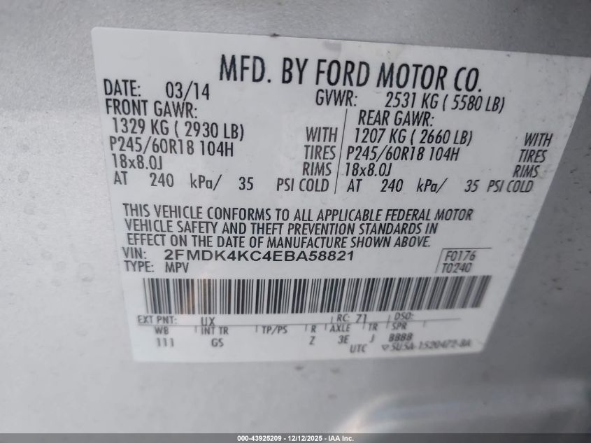 2014 FORD EDGE - 2FMDK4KC4EBA58821, цвет - Серебряный, 3.5, Бензин, Полный привод из США