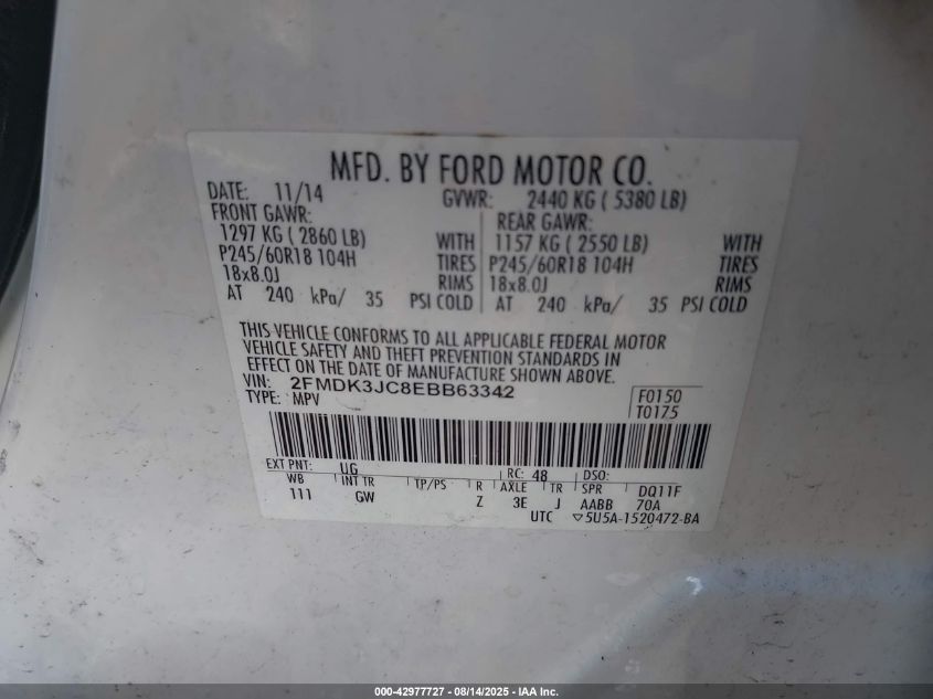 2014 FORD EDGE - 2FMDK3JC8EBB63342, цвет - Белый, 3.5, Бензин, Передний привод из США