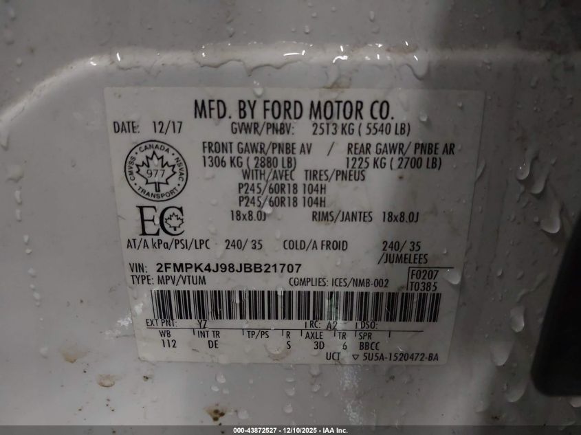 Цвет БелыйЦилиндры 4Привод Полный приводVIN 2FMPK4J98JBB21707Состояние СтационарноПовреждения Передняя или задняя