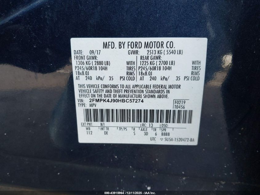 2017 FORD EDGE - 2FMPK4J90HBC57274, цвет - Синий, 2.0, Бензин, Полный привод из США