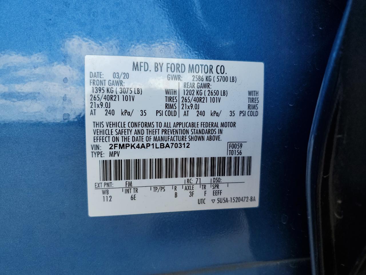 Цвет СинийЦилиндры 6Привод Полный приводVIN 2FMPK4AP1LBA70312Состояние Заводится и едет (проверено)Повреждения Передняя или задняя