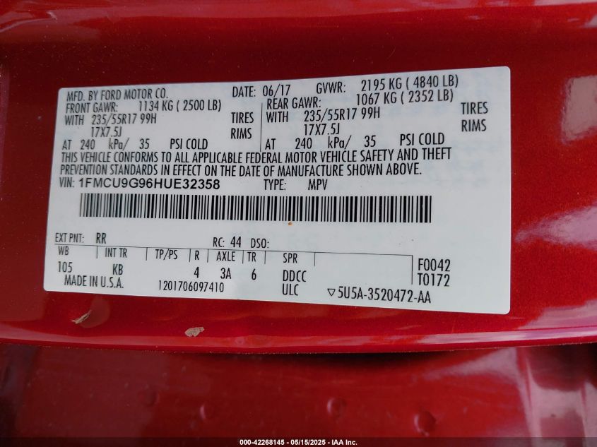 2017 FORD ESCAPE - 1FMCU9G96HUE32358, цвет - Красный, 2.0, Бензин, Полный привод из США