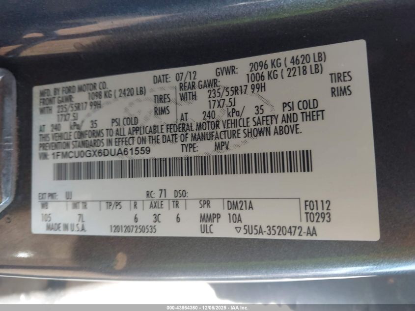 Цвет СерыйЦилиндры 4Привод Передний приводVIN 1FMCU0GX6DUA61559Состояние Заводится и едет (проверено)Повреждения Задняя
