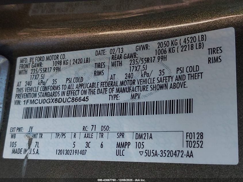 Цвет ЗолотойЦилиндры 4Привод Передний приводVIN 1FMCU0GX6DUC86645Состояние Заводится и едет (проверено)Повреждения Передняя левая