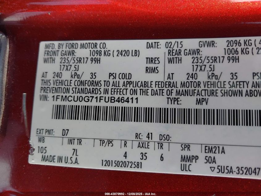 2015 FORD ESCAPE - 1FMCU0G71FUB46411, цвет - Красный, 2.5, Бензин, Передний привод из США