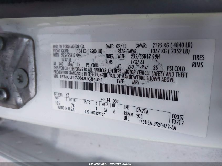 Цвет БелыйЦилиндры 4Привод Полный приводVIN 1FMCU9G96DUC84691Состояние СтационарноПовреждения Передняя или задняя
