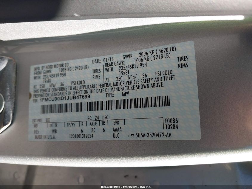 2018 FORD ESCAPE - 1FMCU0GD1JUB47699, цвет - Серебряный, 1.5, Бензин, Передний привод из США