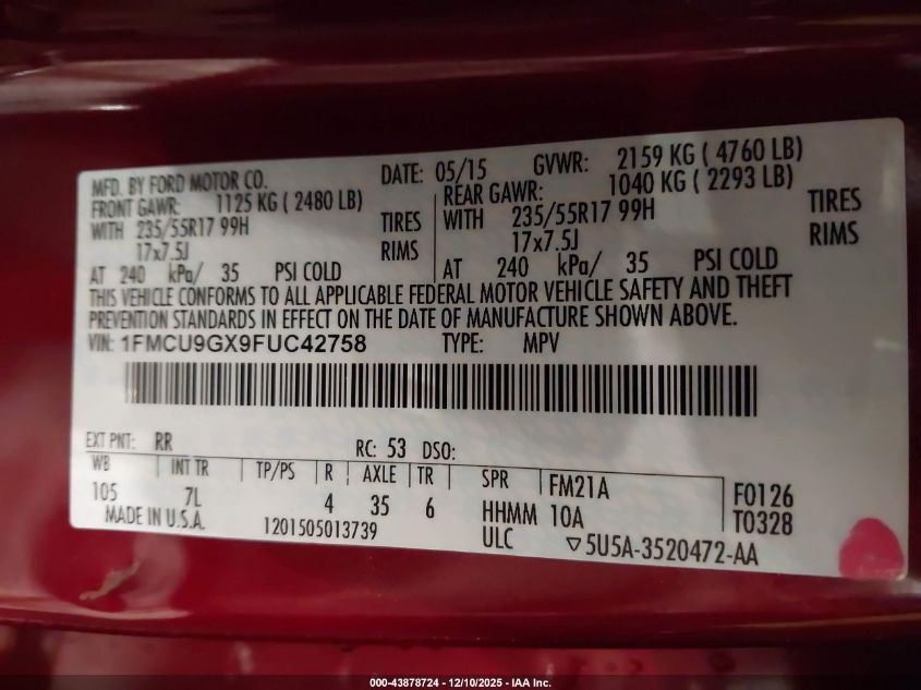 2015 FORD ESCAPE - 1FMCU9GX9FUC42758, цвет - Красный, 1.6, Бензин, Полный привод из США