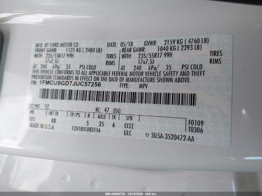 2018 FORD ESCAPE - 1FMCU9GD7JUC57256, цвет - Белый, 1.5, Бензин, Полный привод из США
