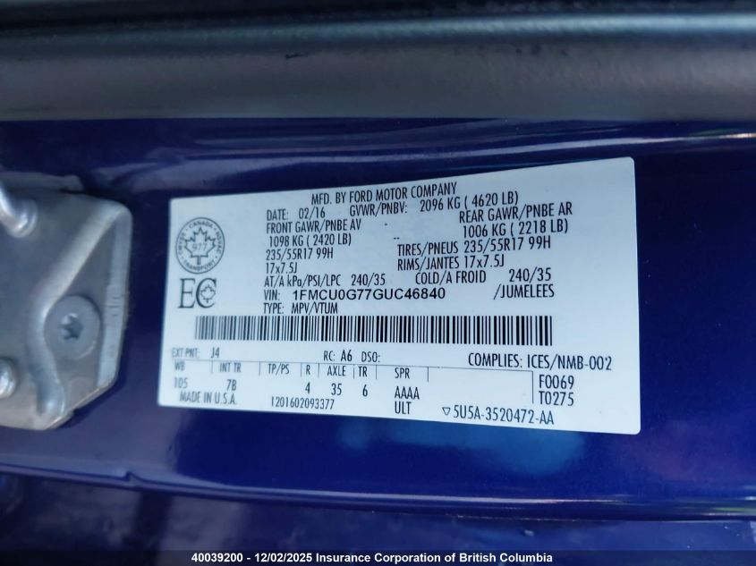 Цвет СинийЦилиндры 4Привод Передний приводVIN 1FMCU0G77GUC46840Состояние СтационарноПовреждения ИнтерьерДата аукциона 2025-12-17