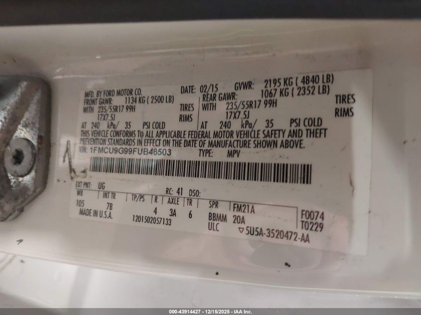 2015 FORD ESCAPE - 1FMCU9G99FUB46503, цвет - Белый, 2.0, Бензин, Полный привод из США