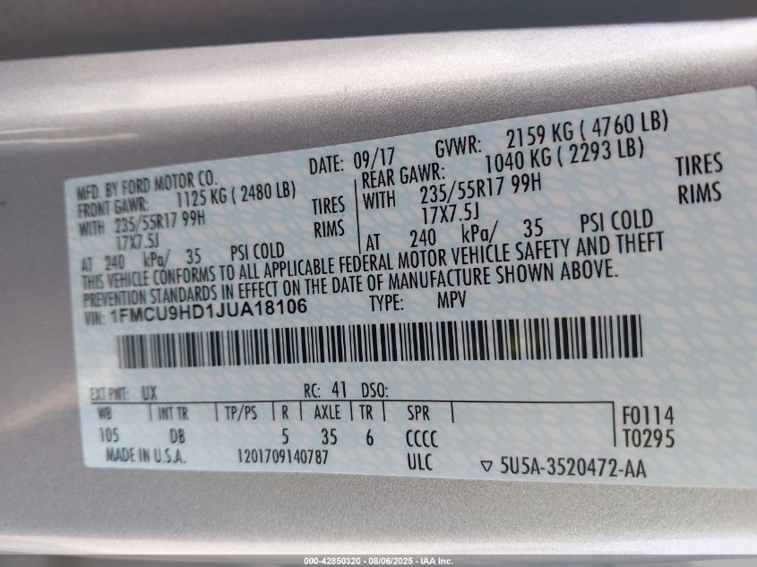 2018 FORD ESCAPE - 1FMCU9HD1JUA18106, цвет - Серебряный, 1.5, Бензин, Полный привод из США