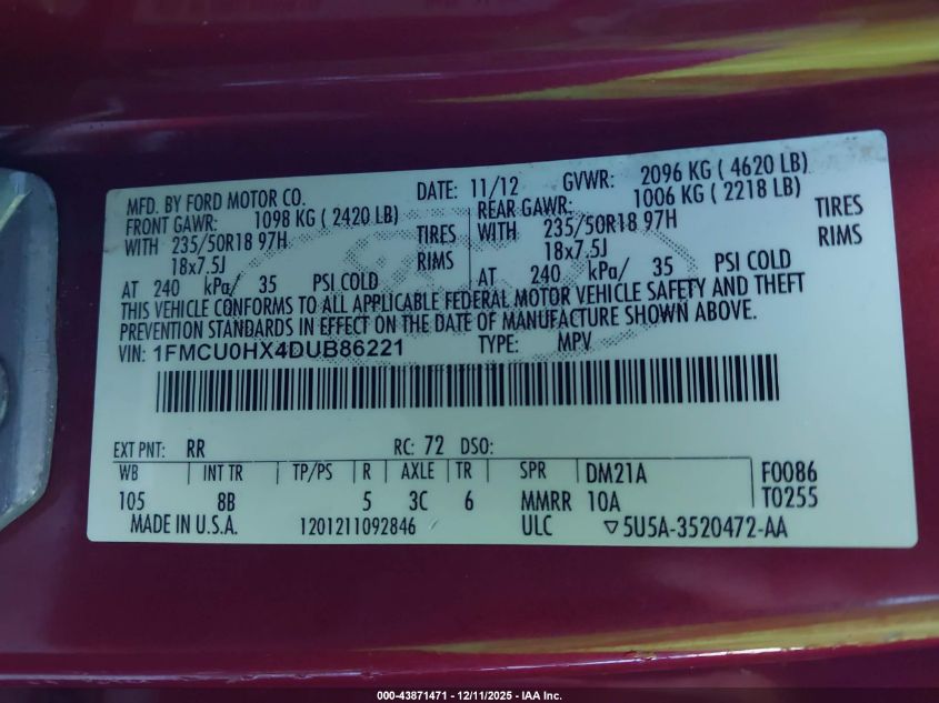 2013 FORD ESCAPE - 1FMCU0HX4DUB86221, цвет - Красный, 1.6, Бензин, Передний привод из США