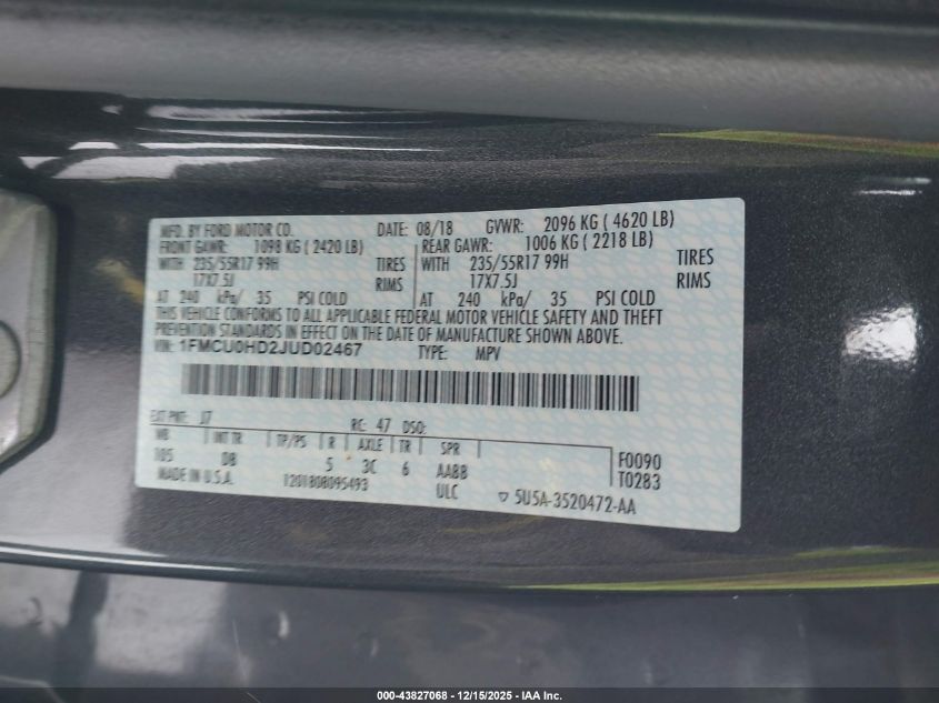 2018 FORD ESCAPE - 1FMCU0HD2JUD02467, цвет - , 1.5, Бензин, Передний привод из США