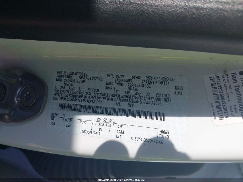 2023 FORD ESCAPE - 1FMCU0MN1PUB12117, цвет - Белый, 1.5, Бензин, Передний привод из США