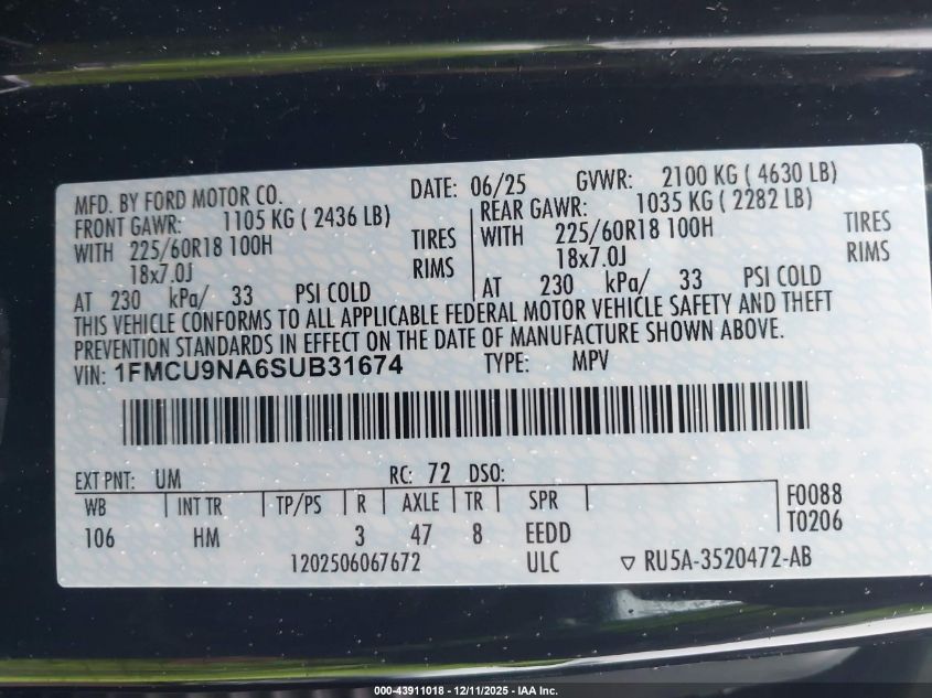 2025 FORD ESCAPE - 1FMCU9NA6SUB31674, цвет - Черный, 2.0, Бензин, Полный привод из США