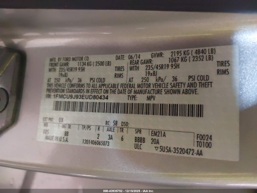 2014 FORD ESCAPE - 1FMCU9J93EUD80434, цвет - Серебряный, 2.0, Бензин, Полный привод из США