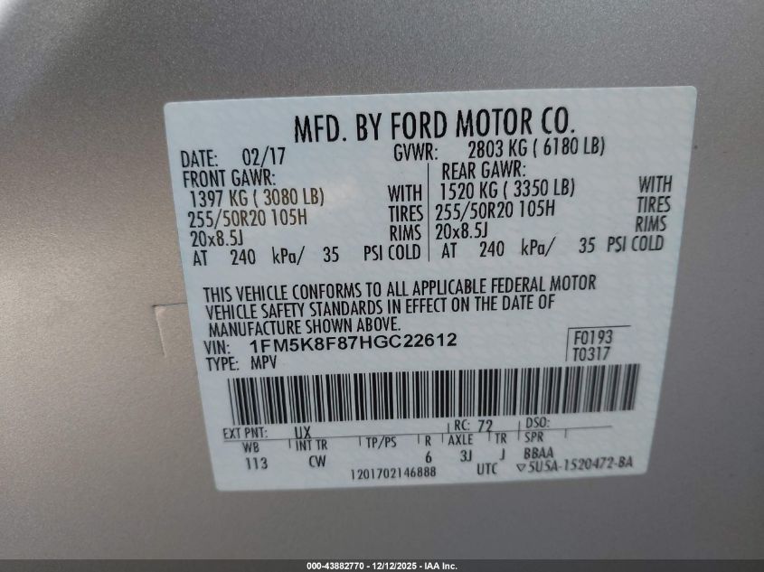 Цвет СеребряныйЦилиндры 6Привод Полный приводVIN 1FM5K8F87HGC22612Состояние СтационарноПовреждения Передняя или задняя