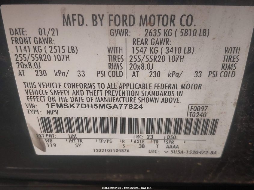 Цвет ЧерныйЦилиндры 4VIN 1FMSK7DH5MGA77824Состояние СтационарноПовреждения Передняя левая