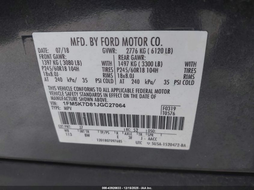 Цвет СерыйЦилиндры 6Привод Передний приводVIN 1FM5K7D81JGC27064Состояние Заводится и едет (проверено)Повреждения Передняя или задняя