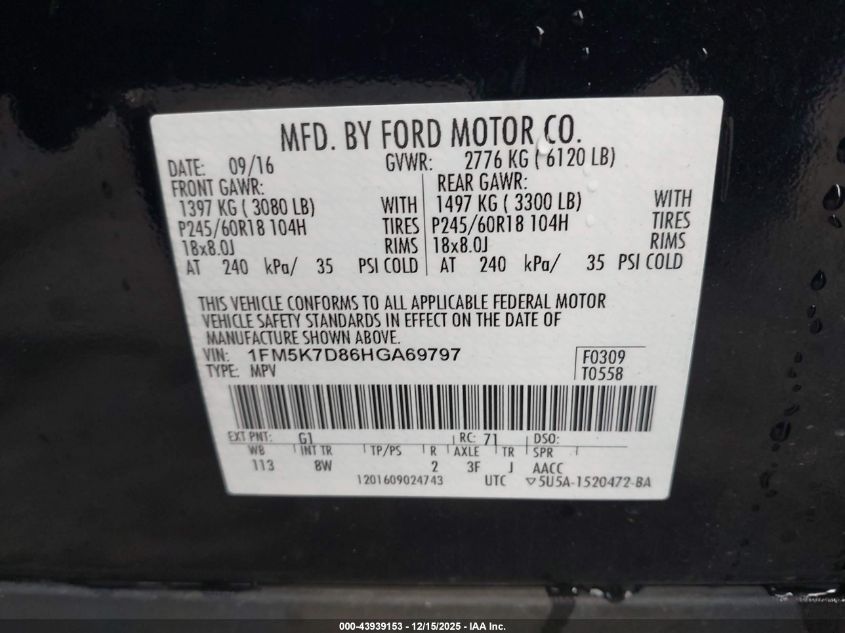 Цвет ЧерныйЦилиндры 6Привод Передний приводVIN 1FM5K7D86HGA69797Состояние Заводится и едет (проверено)Повреждения Задняя