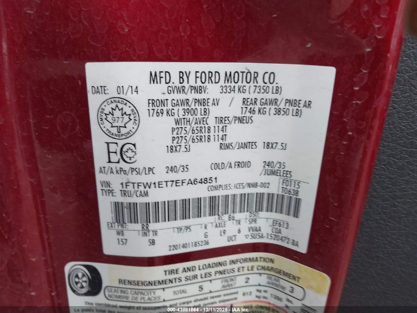 2014 FORD F-150 - 1FTFW1ET7EFA64851, цвет - Красный, 3.5, Бензин, Полный привод из США