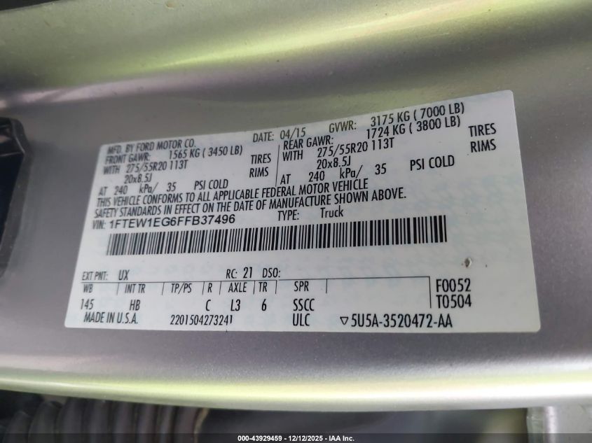 2015 FORD F-150 - 1FTEW1EG6FFB37496, цвет - Серебряный, 3.5, Бензин, Полный привод из США