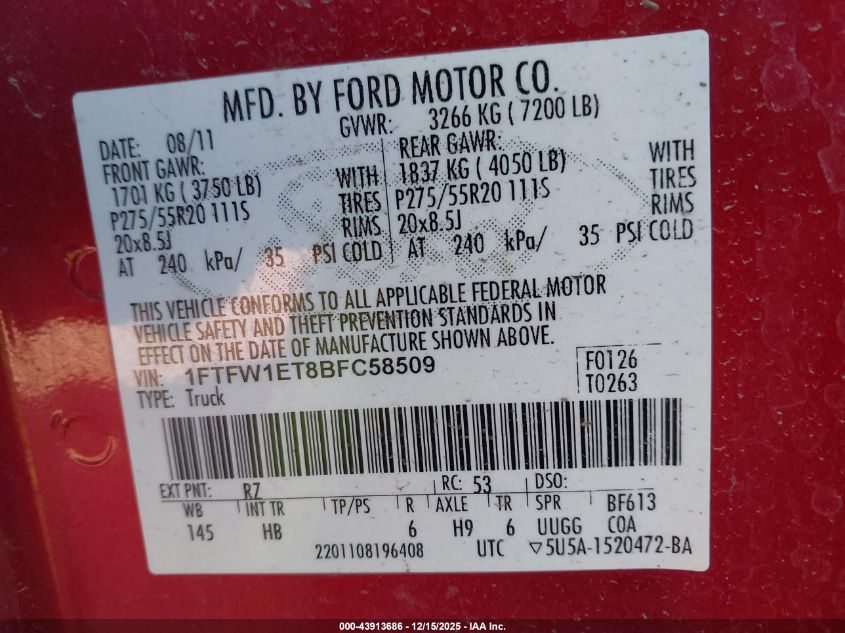 2011 FORD F-150 - 1FTFW1ET8BFC58509, цвет - Красный, 3.5, Бензин, Полный привод из США
