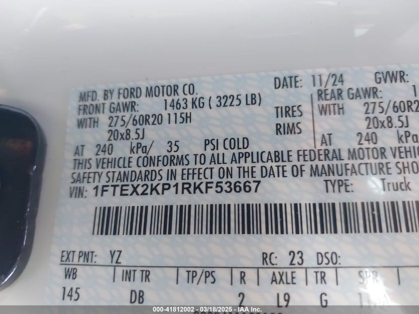 2024 FORD F-150 - 1FTEX2KP1RKF53667, цвет - Белый, 2.7, Бензин, из США