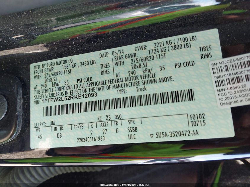 2024 FORD F-150 - 1FTFW2L52RKE12093, цвет - Черный, 5.0, Бензин, Полный привод из США
