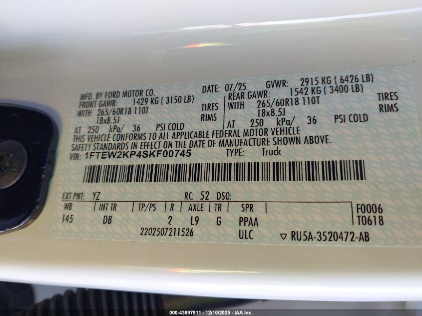 2025 FORD F-150 - 1FTEW2KP4SKF00745, цвет - Белый, 2.7, Бензин, из США
