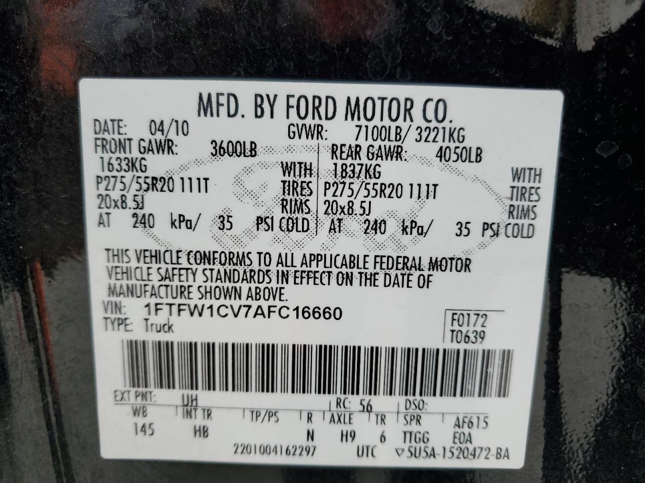2010 FORD F-150 - 1FTFW1CV7AFC16660, цвет - Черный, 5.4, Бензин, Задний привод из США