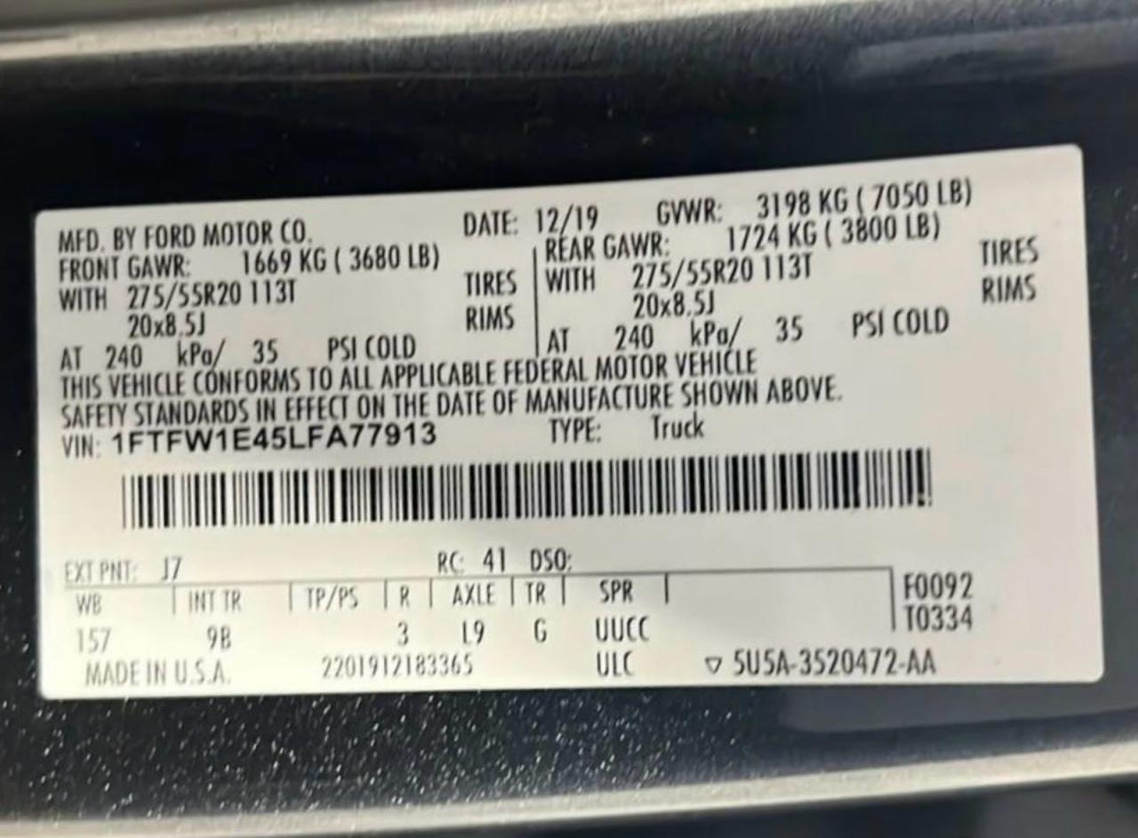 Цвет СерыйЦилиндры 6Привод 4x4 с задним приводомVIN 1FTFW1E45LFA77913Состояние Заводится и едет (проверено)Повреждения НезначительныеДата аукциона 2025-10-07