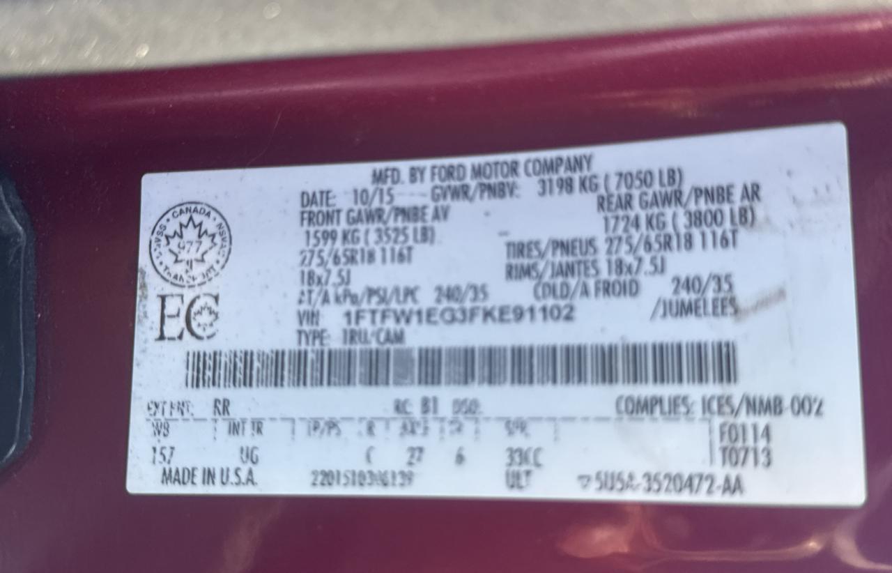 Цвет КрасныйЦилиндры 6Привод 4x4 с задним приводомVIN 1FTFW1EG3FKE91102Состояние Заводится и едет (проверено)Повреждения НезначительныеДата аукциона 2025-10-08