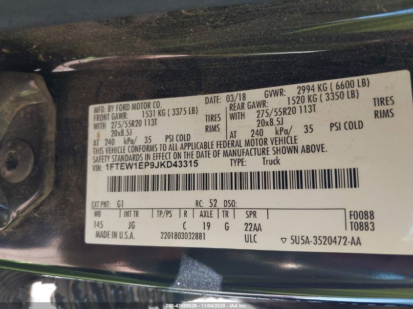 Цвет ЧерныйЦилиндры 6Привод Полный приводVIN 1FTEW1EP9JKD43315Состояние Заводится и едет (проверено)Повреждения Передняя правая