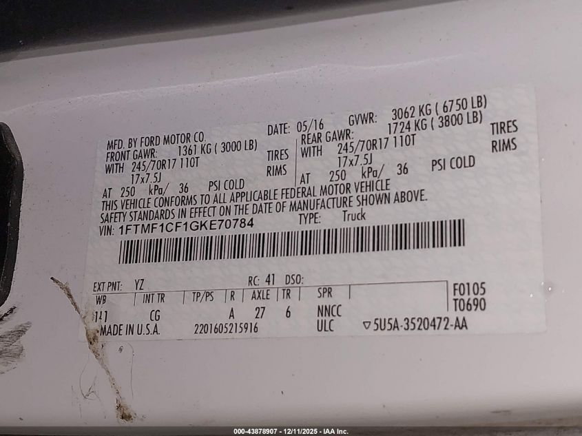 2016 FORD F-150 - 1FTMF1CF1GKE70784, цвет - Белый, 5.0, Бензин, из США