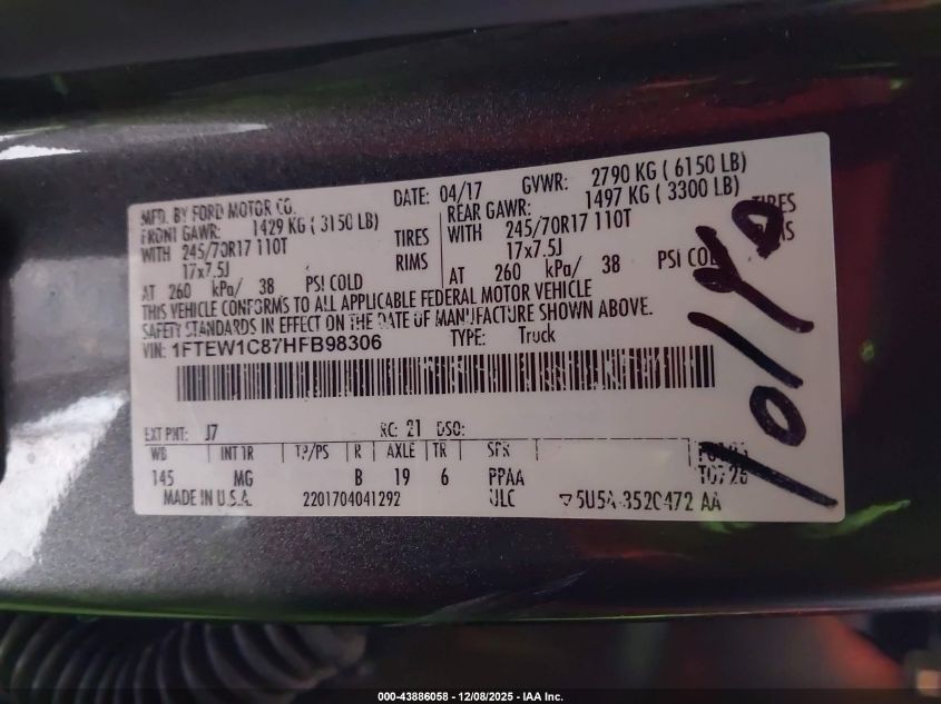 Цвет СерыйЦилиндры 6VIN 1FTEW1C87HFB98306Состояние Заводится и едет (проверено)Повреждения Обычный износДата аукциона 2025-12-30