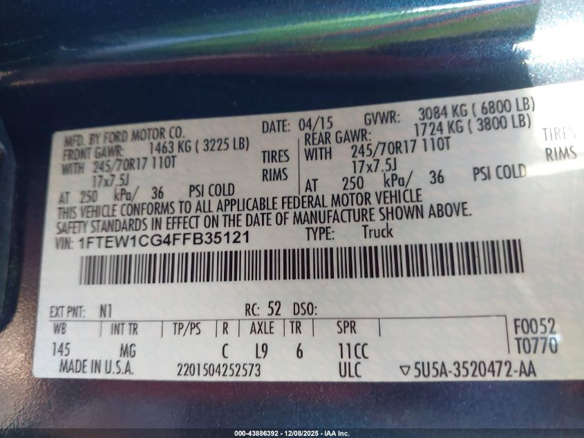 2015 FORD F-150 - 1FTEW1CG4FFB35121, цвет - Синий, 3.5, Бензин, из США