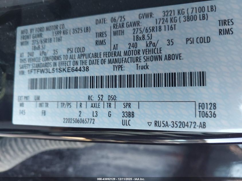 2025 FORD F-150 - 1FTFW3L51SKE64438, цвет - Черный, 5.0, Бензин, Полный привод из США