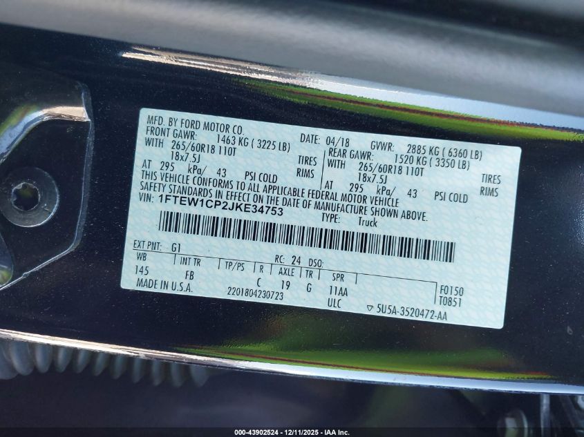 2018 FORD F-150 - 1FTEW1CP2JKE34753, цвет - Черный, 2.7, Бензин, из США