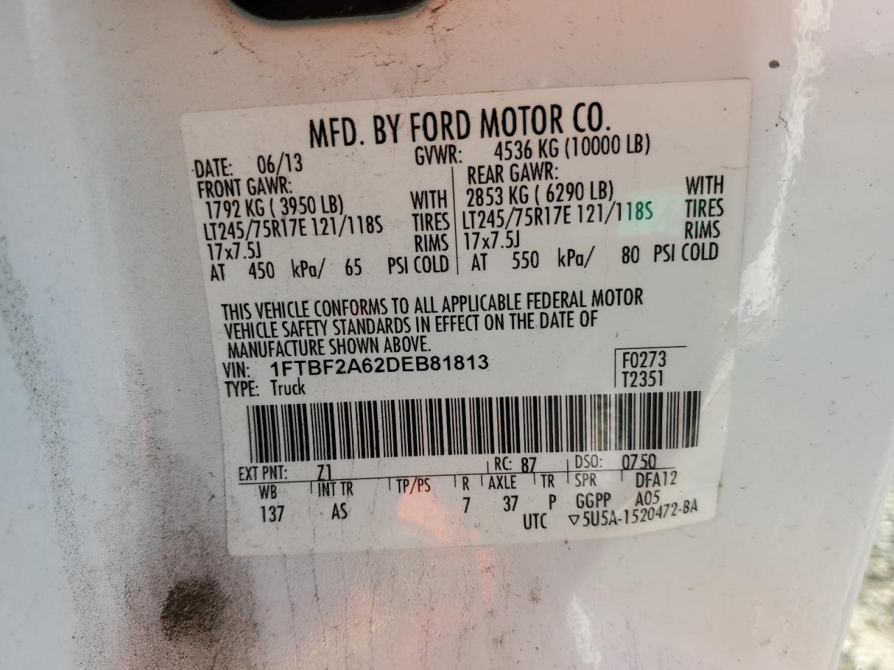 Цвет БелыйЦилиндры 8Привод Задний приводVIN 1FTBF2A62DEB81813Состояние Заводится и едет (проверено)Повреждения НезначительныеДата аукциона 2025-10-07