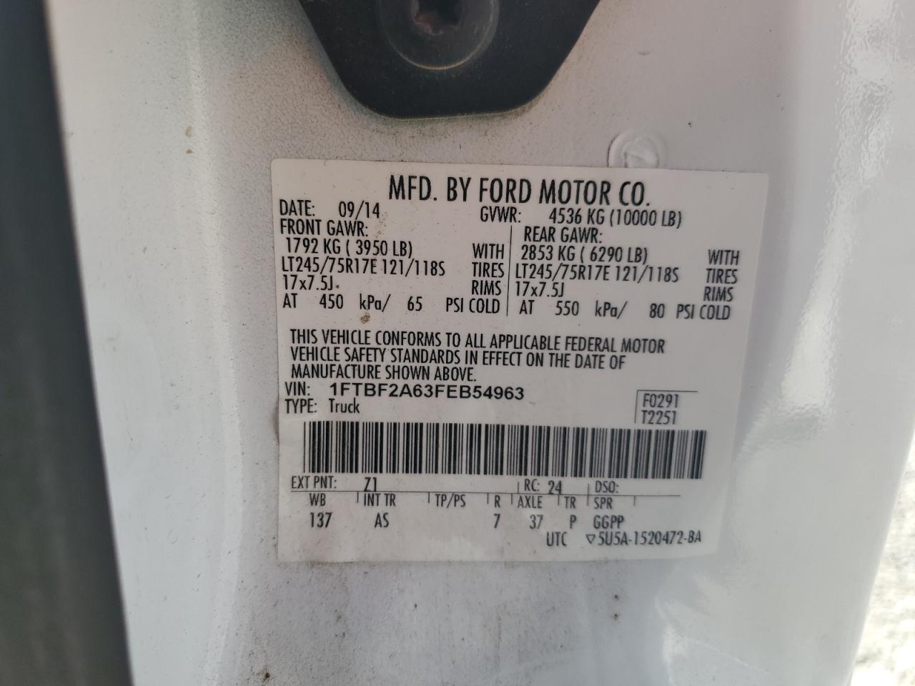 Цвет БелыйЦилиндры 8Привод Задний приводVIN 1FTBF2A63FEB54963Состояние Заводится и едет (проверено)Повреждения Передняя или задняяДата аукциона 2025-10-15