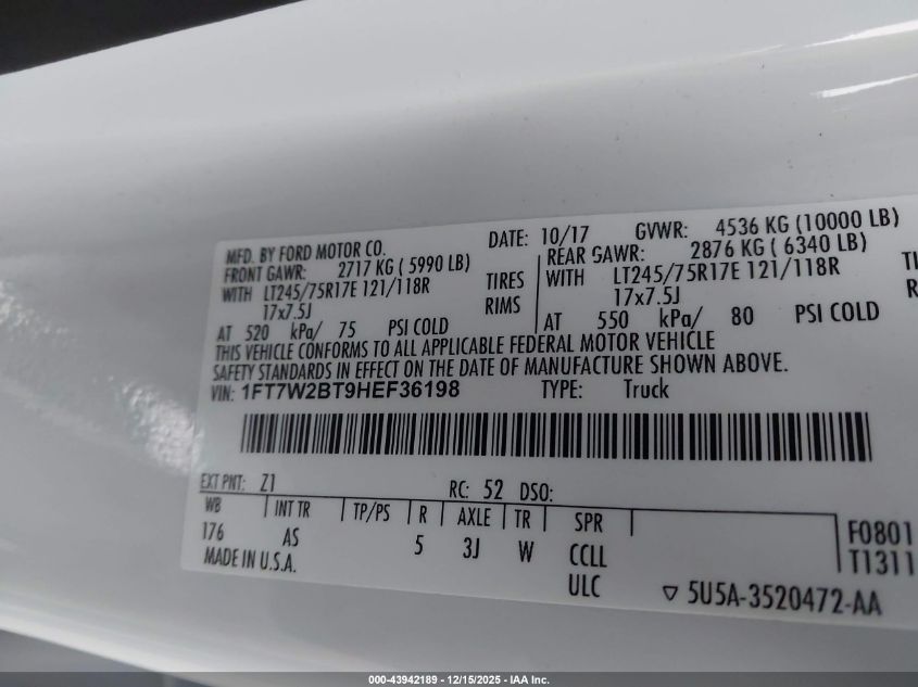 Цвет БелыйЦилиндры 8Привод Полный приводVIN 1FT7W2BT9HEF36198Состояние Заводится и едет (проверено)Повреждения Обычный износ