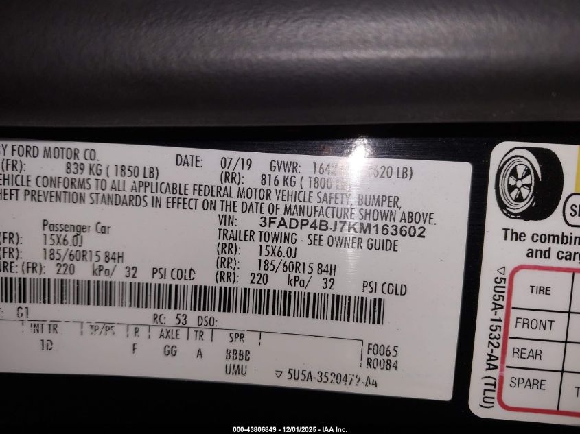 2019 FORD FIESTA - 3FADP4BJ7KM163602, цвет - Черный, 1.6, Бензин, Передний привод из США