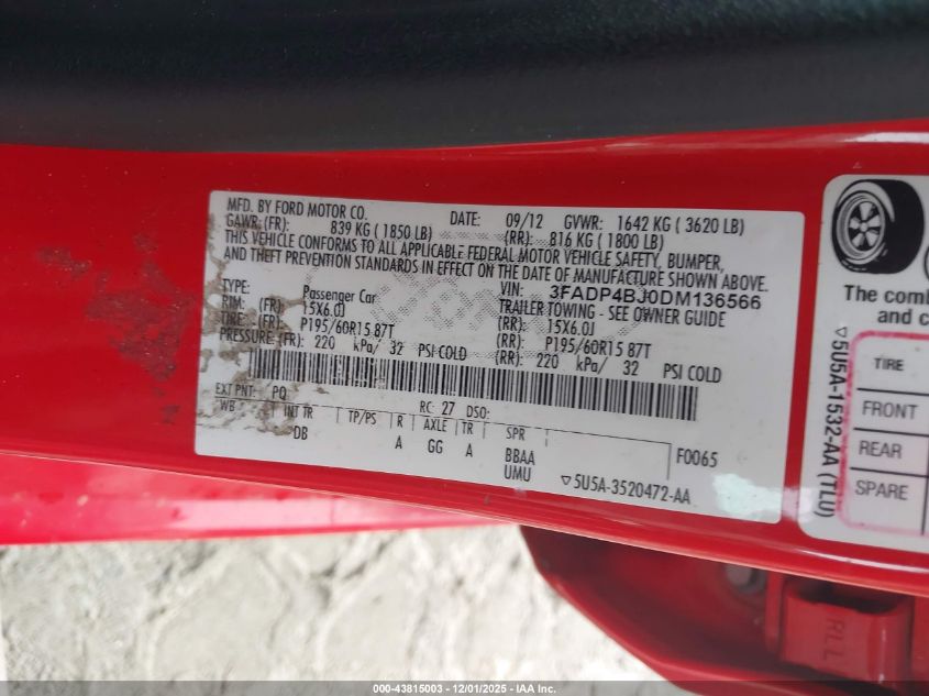 Цвет КрасныйЦилиндры 4Привод Передний приводVIN 3FADP4BJ0DM136566Состояние Заводится и едет (проверено)Повреждения Передняя или задняя