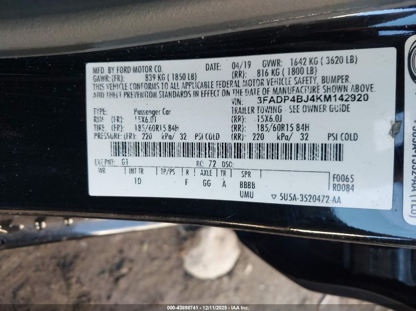 Цвет ЧерныйЦилиндры 4Привод Передний приводVIN 3FADP4BJ4KM142920Состояние Заводится и едет (проверено)Повреждения Обычный износ