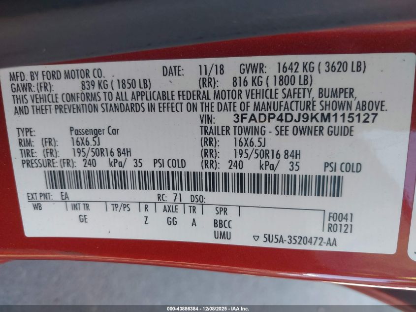 Цвет КрасныйЦилиндры 4Привод Передний приводVIN 3FADP4DJ9KM115127Состояние Заводится и едет (проверено)Повреждения Обычный износДата аукциона 2025-12-16