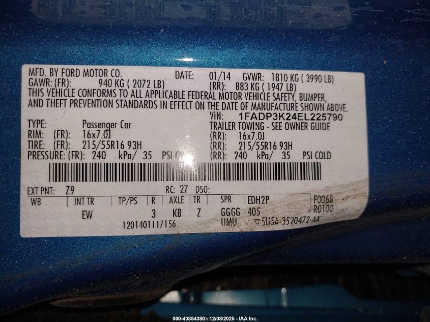 Цвет СинийЦилиндры 4Привод Передний приводVIN 1FADP3K24EL225790Состояние СтационарноПовреждения Передняя или задняя