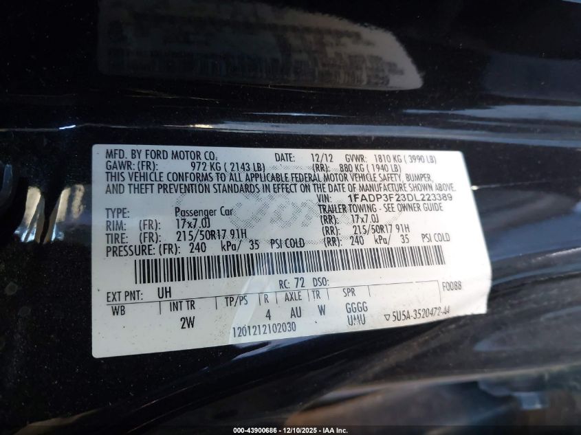 2013 FORD FOCUS - 1FADP3F23DL223389, цвет - Черный, 2.0, Бензин, Передний привод из США