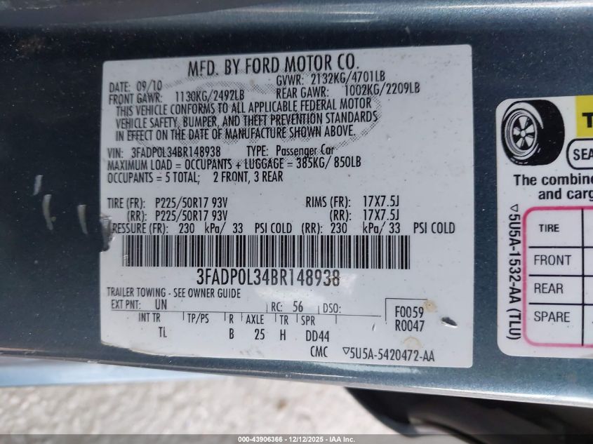 Цвет СинийЦилиндры 4Привод Передний приводVIN 3FADP0L34BR148938Состояние Заводится и едет (проверено)Повреждения Передняя или задняя